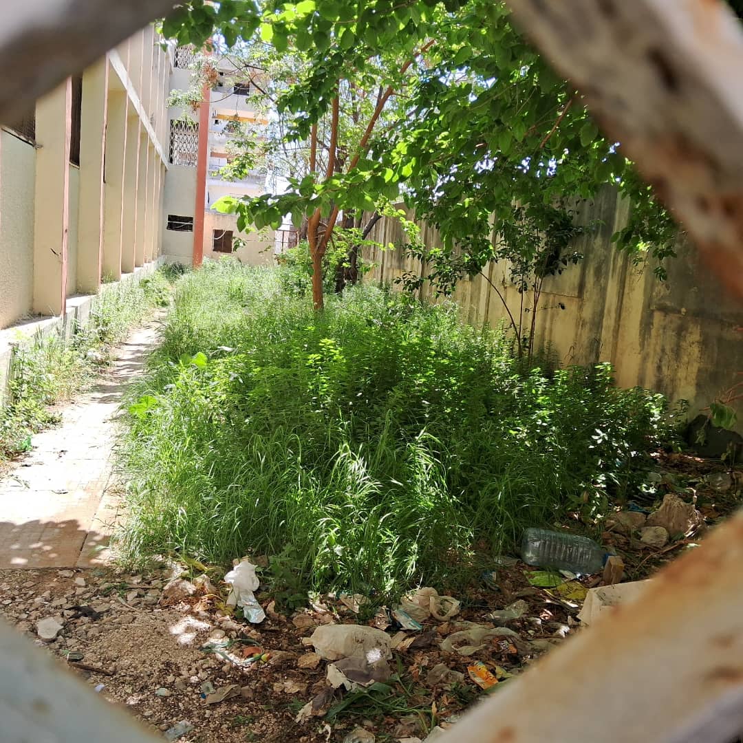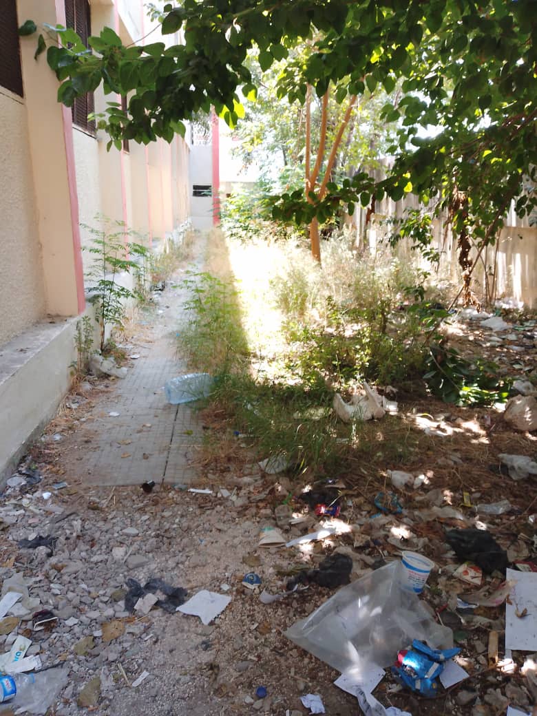 كما أن ساحة المدرسة تحتاج لإعادة تأهيل بسبب تراكم العشب والنفايات فيها.